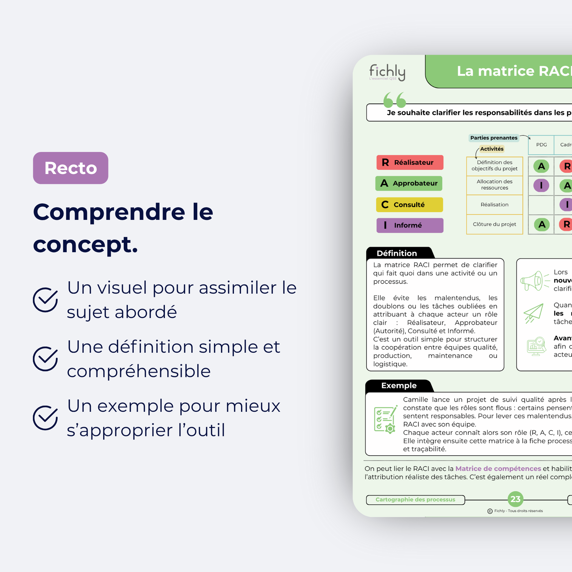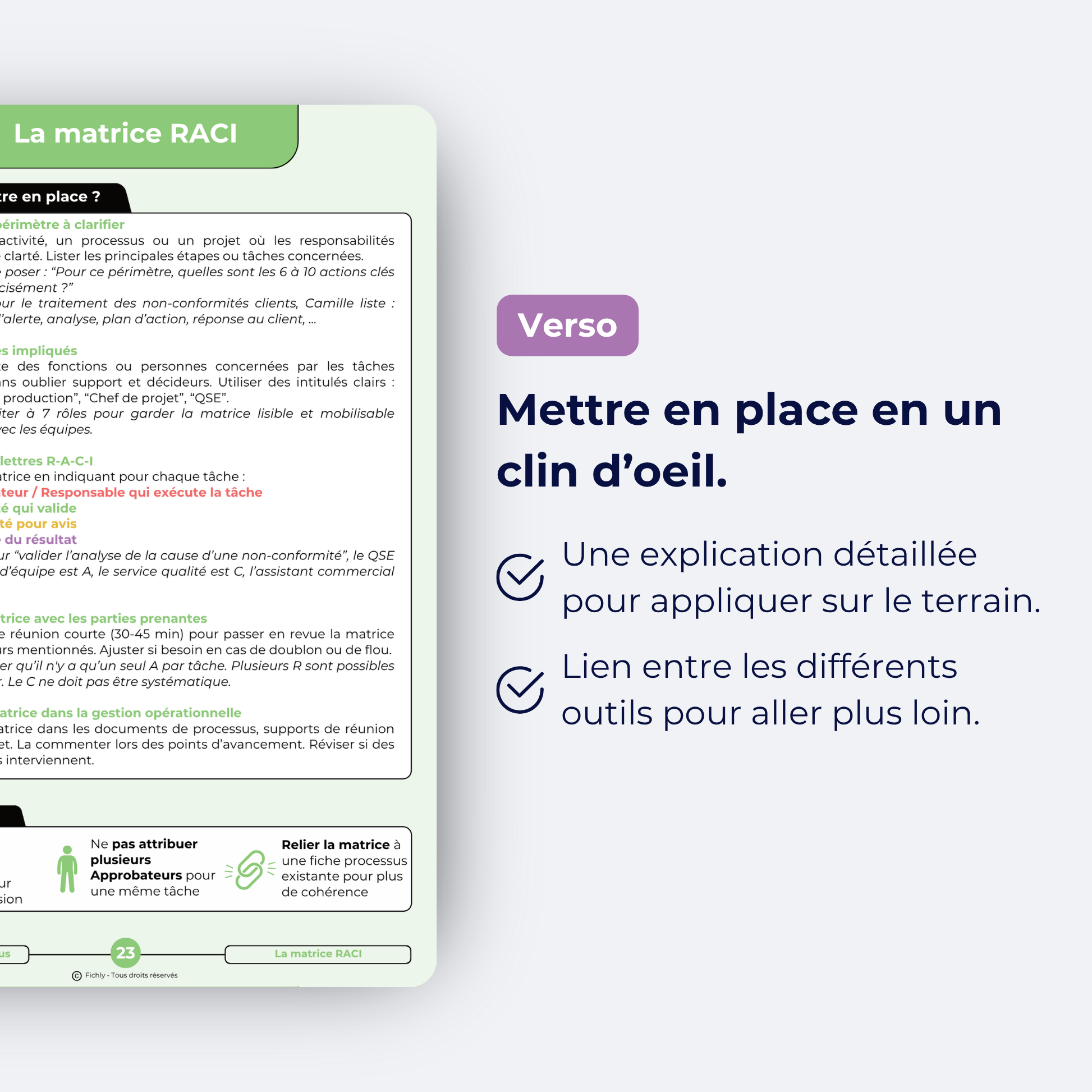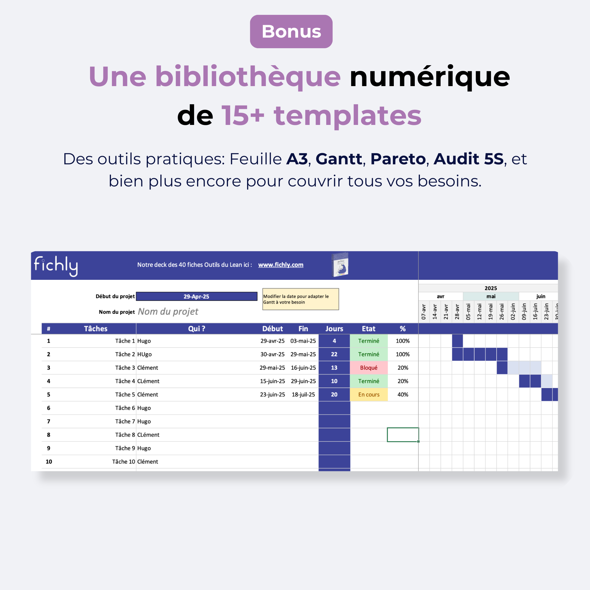 fiches A3, plans d’action, tableaux d’analyse, checklists…