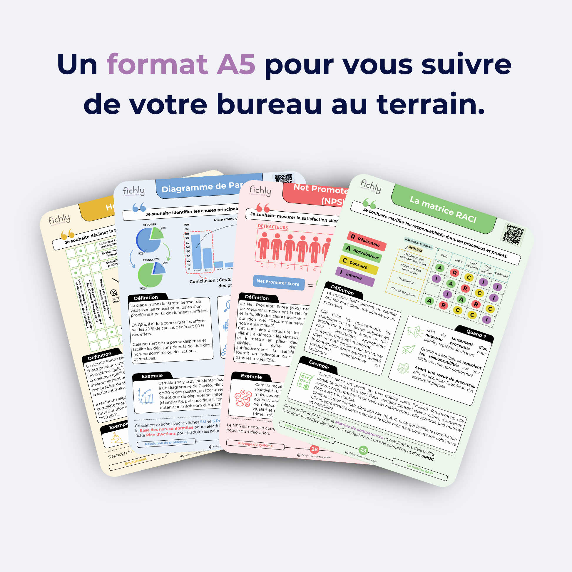 Un deck de 40 fiches imprimées en France, conçu pour vous guider pas à pas dans la mise en œuvre de votre démarche QSE de la compréhension des enjeux jusqu’au pilotage opérationnel sur le terrain.